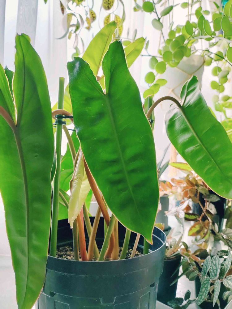 矢じり型の葉っぱとオレンジの茎とのバランスがカッコいいフィロデンドロン。