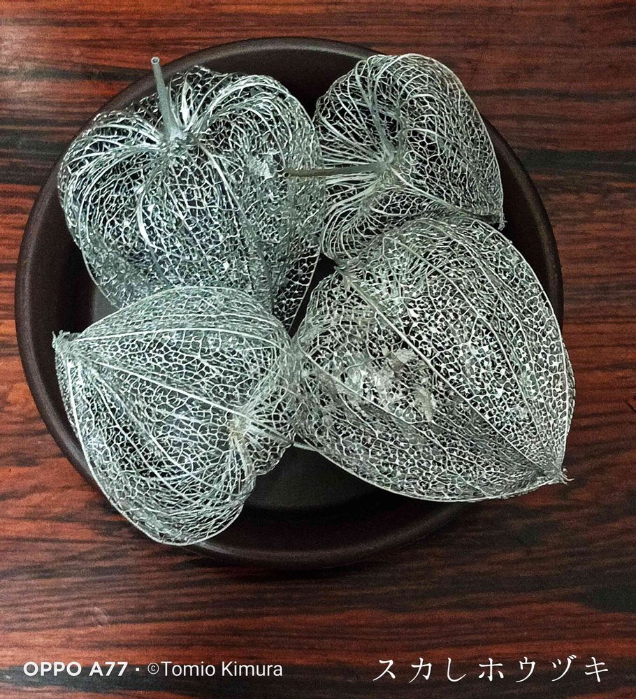 ホウヅキを、水に浸し、繊維だけを残した、スカシホウヅキが、約10日で出来上がります。