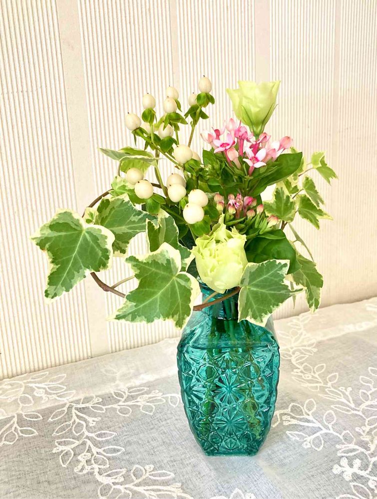 花たちはスーパーで見つけた「サステナフラワー」なんです😄 花瓶もリサイクルガラス♻️のもので…