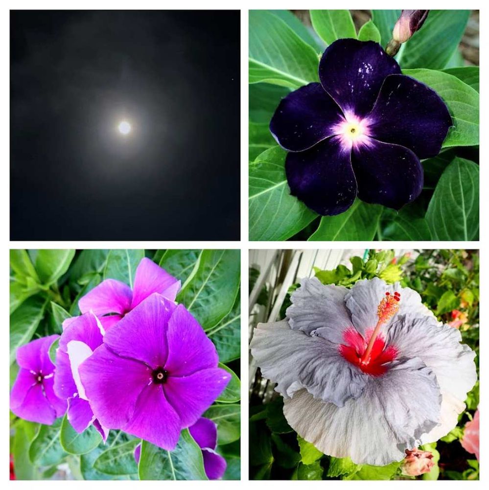 一昨日のスーパーブルームーン🌕に、5月に種まきしたニチニチソウのジャムズ&ジェリー・ブルーベリーと、ブラックベリー、毎度おなじみハイビスカスのデニムブルーを合わせてみました😊
