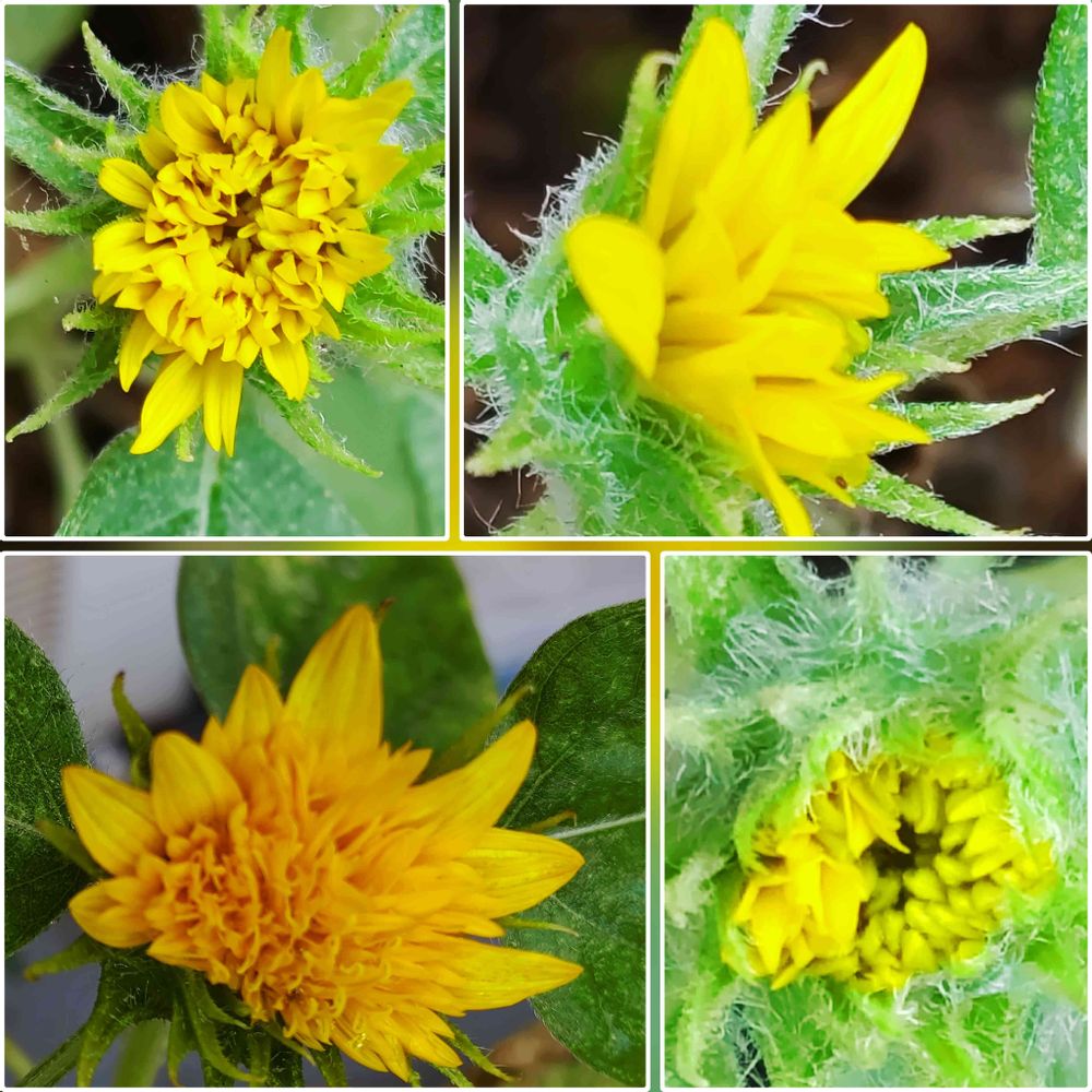 やっと復活して小さく咲いた、又は咲きかけているミニひまわりです。