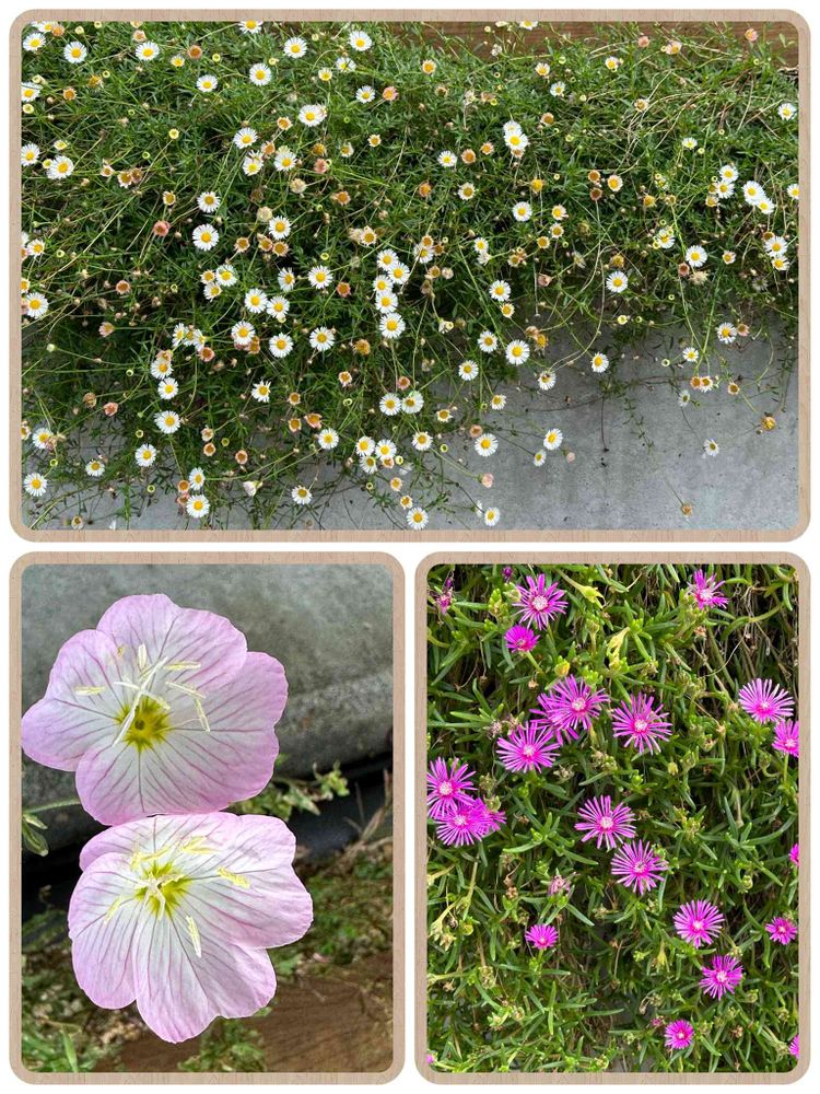 エリゲロンは花の下の砂利からも芽を出して咲いていますし、松葉菊は被災した所から掘り起こしてきてずっと咲いているとても強い花達です🌸✨