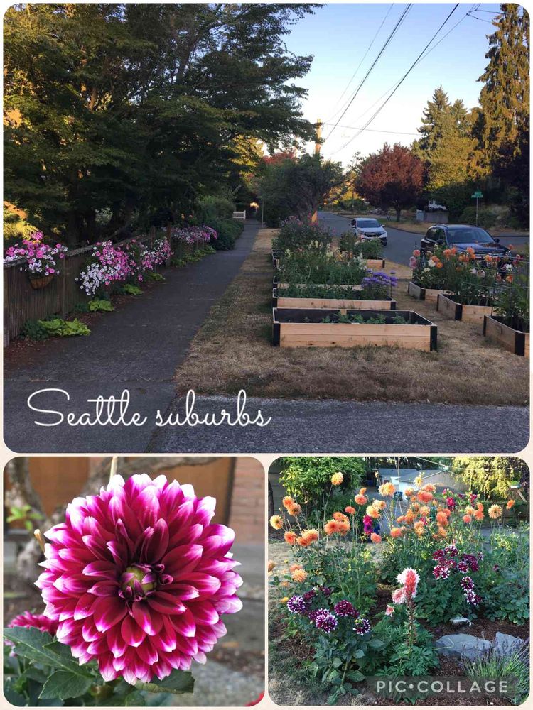 アメリカ シアトルの友人が散歩中に見かけた、お花好きなフラワーハウスの前のレイズドベッドとダリアたち💐