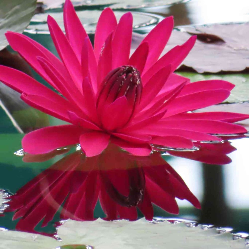 (夜咲き種)レッドフレアーは大輪の濃い赤花を咲かせ、夜咲き赤系品種の中では最も色が濃い品種の一つです。花は花弁を大きく開く、夜咲き種独特の花型をしています。(初日はカップ状、もしくはフラットに咲き、二日目以降大きく花を広げることが多いようです。) 葉も濃い赤茶色で、昼咲き種とはかなり雰囲気が異なります。夜咲き種は、昼咲き種と比べ、株がやや大型ですが、性質が強いため、大変育て易い品種でもあります。またレッドフレアーは、他の夜咲き種に比べ、開花する時間が少し早く、閉じるのが数時間ほど遅いため、長時間花を楽しむことが出来ます。(裁培条件などにより、時間は多少前後します。) 花上がりも良好で、大輪の夜咲き種の中にあっても、さらに一回り大きな花が水面上でも大変目立つ品種です。