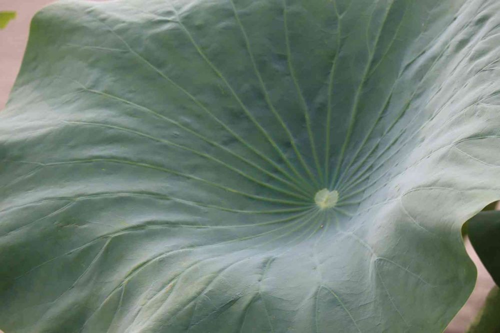 蓮の葉の中心には荷鼻(通称へそ)と呼ばれる気孔があり、周りの環境で葉内にできた酸素を地下茎に送り、地下茎は呼吸して二酸化炭素を送り出すのだそうです。