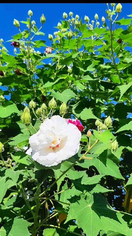 おはようございます❗とっても青い空とまだまだ咲くスイフヨウ、🍃風も強く吹いてますね🌀