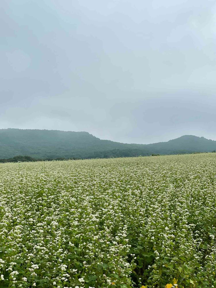 朝霧の中の一面の蕎麦の花、幻想的な広大な風景がとても美しくです。