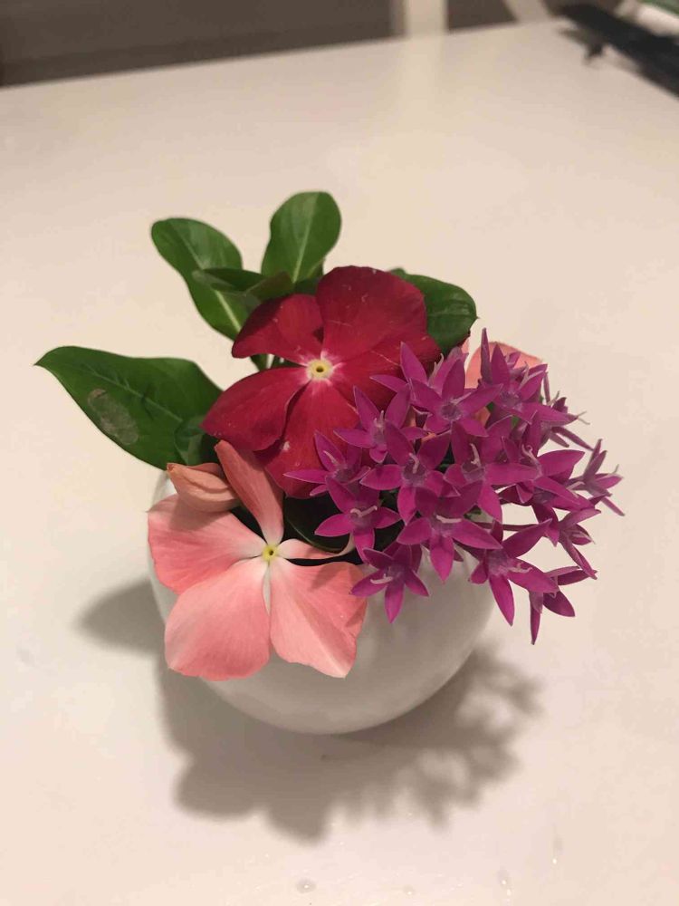 摘芯したお花はこんな感じで活けてみました。容れ物はケーキ屋さんで買ったプリンの容器。ニチニチソウは葉っぱが可愛い💕