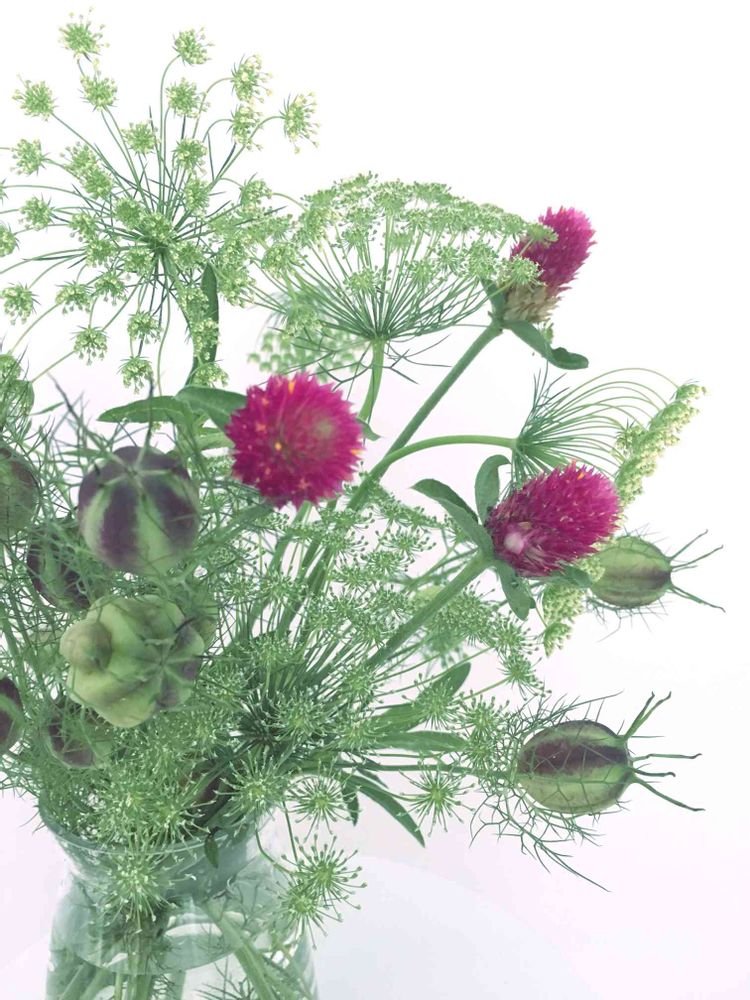 買ってきたレースフラワーとニゲラの実にお庭に咲いていたセンニチコウを加えて