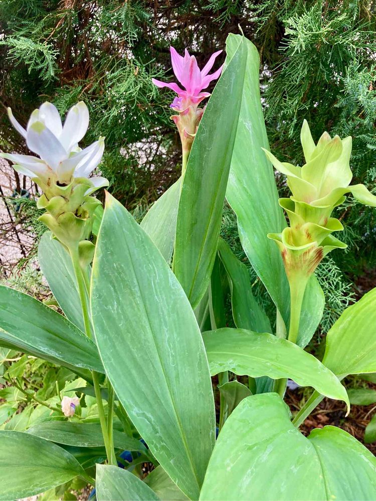 ウチのクルクマは花壇に4本うえてますがまだ咲いてません。一本だけツボミらしきものを付けてます。たぶん白です。初めて植えたので開花が待ち遠しいです。球根もユニークですよね。