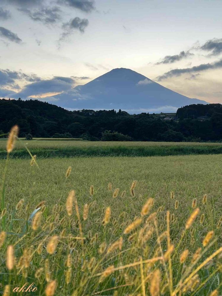 そうそう ちょっと光りがあたって黄金色に輝いているかんじとか夕景に浮かぶ富士山の稜線 山の林の影 そして空に浮かぶ雲