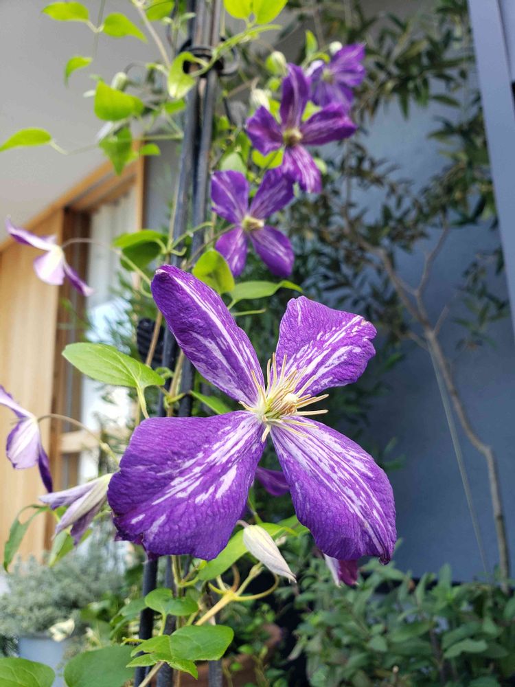 鮮やかな紫に白~薄青の絞りが入ってます。まさにタイダイ染めのような花色のクレマチス🌱