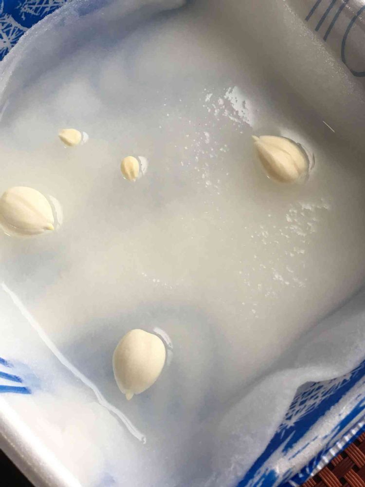 普通だと越冬しないと芽が出ないらしいのですが、仁をむき出しにしてやると芽が出ると聞いて実験中です。