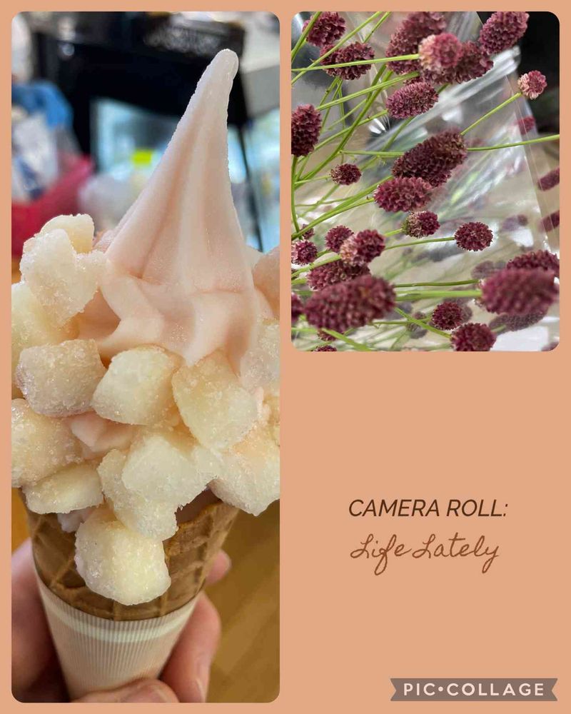 和歌山のあら川の桃を凍らした桃のソフトクリーム🍑とワレモコウの切り花買いました💕