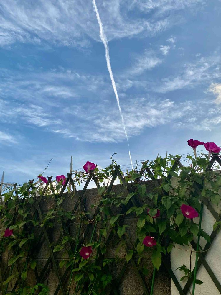 青空と飛行機雲と、アサガオの、良いpicが、撮れましたね😆