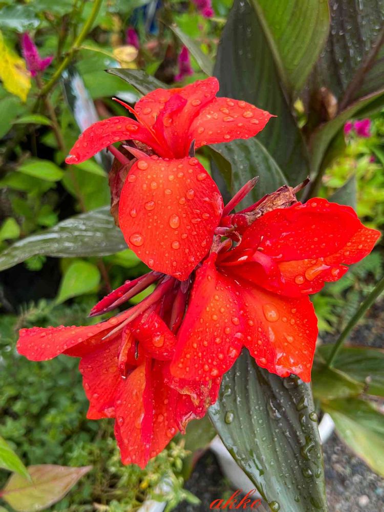 真っ赤なカンナも、雨粒をいっぱい付けて咲いてます♥️