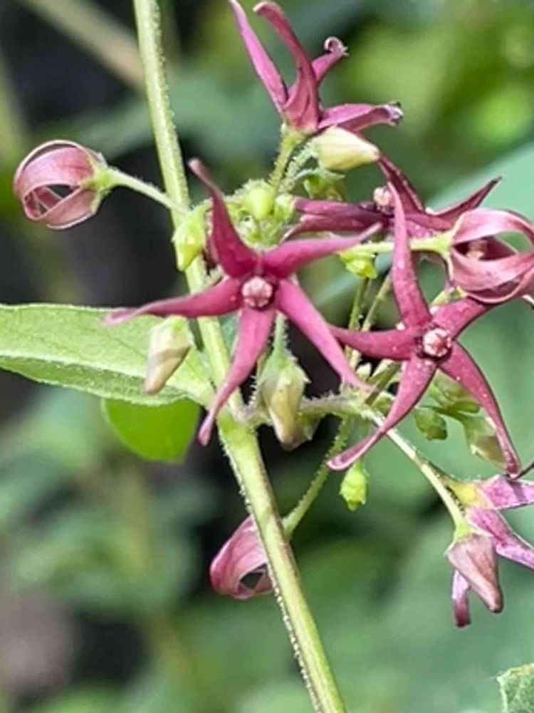 つる植物で、星形の暗紫色の小さな花をたくさんつけます。