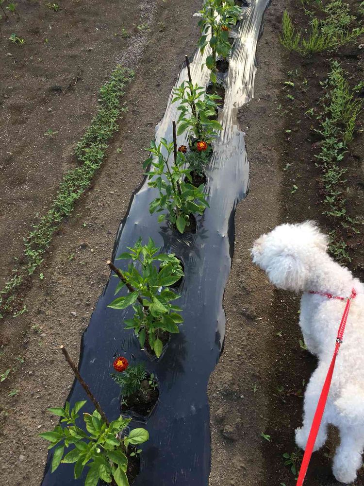 ピーマンの隣りのナス畑にもマリーゴールドが