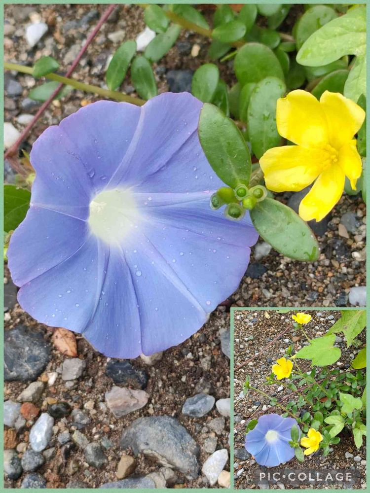 こぼれ種で咲いてるポーチュラカ💛のお花と庭に何処にでも植えてるあさがお🩵のお花です✨