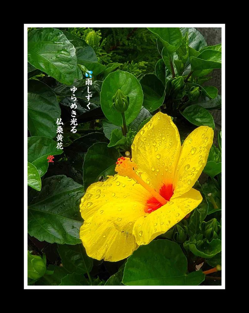 ;黄色のハイビスカスとともに雨しずく💦がゆらゆら揺れていてとても綺麗です。