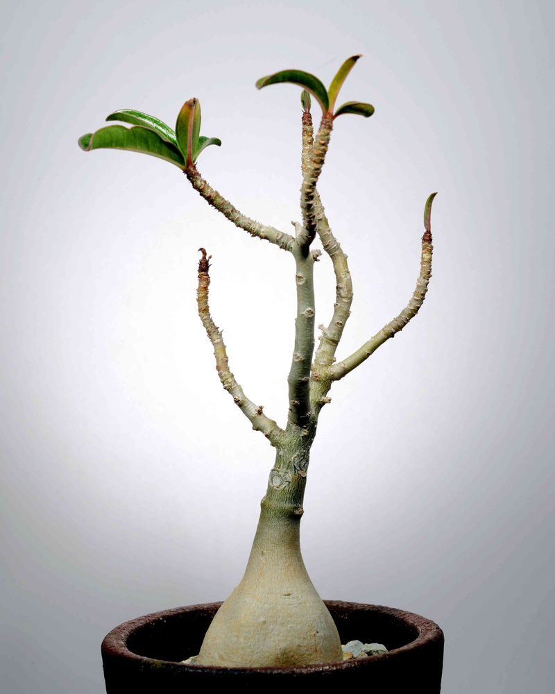 原種アデニウムの一種のアデニウム・スワジクムです。南アフリカ北東部あたりの出身です。氷点下にも耐えるという耐寒性があるということですが、冬場に外に出すのは怖いので試したことはありません。