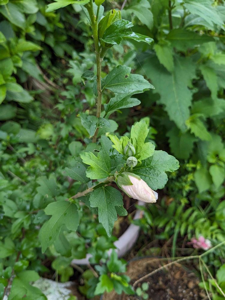 ムクゲ、鉢に植えてます。これ以上成長しないでと、根っこ飛び出してしまいそうです。😭