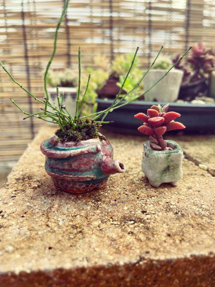 最近、山野草を始めました。旦那は盆栽、私は下草を学び始めました。 自宅で陶芸しています、豆鉢など作っています。の