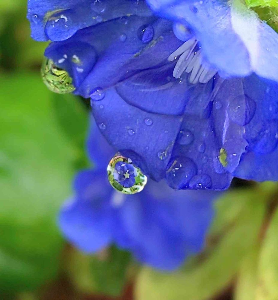 アメリカンブルーの水滴の中に、アメリカンブルーが咲いてます💙💙