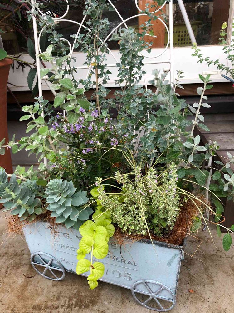 シルバープランツを寄せ集めブリキカートにアレンジしました〜🌿