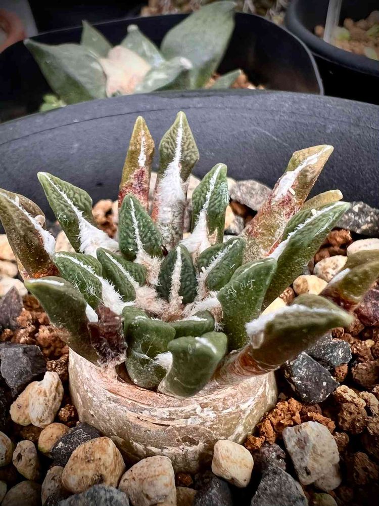 アリオカルプス黒牡丹、ひと夏越して殆ど成長無し、日に焼けただけのような。アリオカルプスは成長が遅く日焼けしやすいって本当なんだと確認できました😅