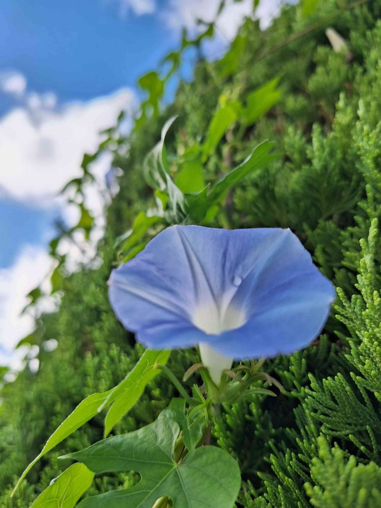 この小さな朝顔は、勝手に生えてきてフェンスをつたい、すごい勢いで、イブキに絡み付いています。