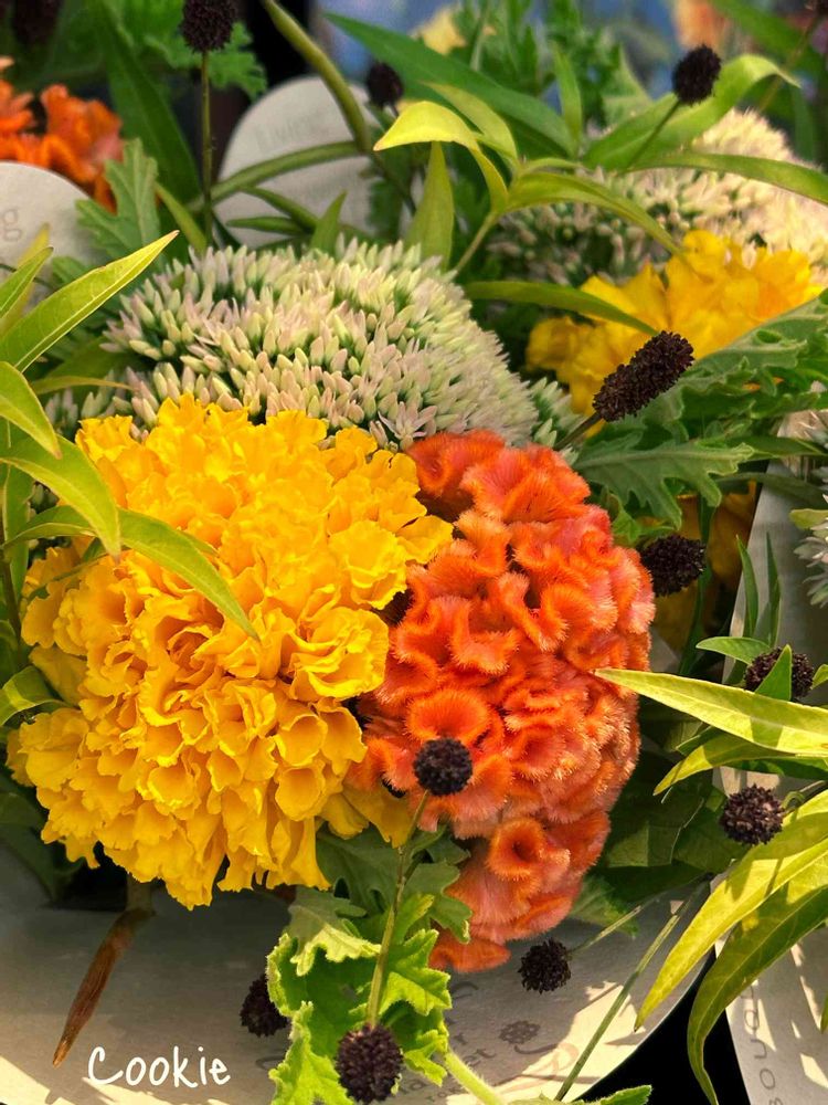 お出かけ先の大好きな花屋さんで小さな秋🍂を見つけました💓セダム オータムジョイ、ケイトウ オレンジクイーン、アフリカンマリーゴールドにワレモコウ🍂