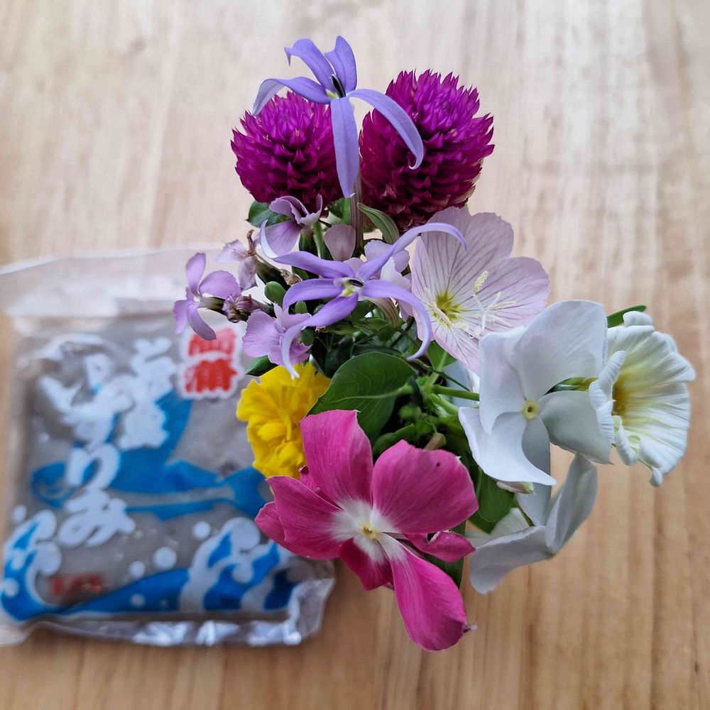 花たちの左に有るのは佐渡の実家に帰ってた知人からいただいたトビウオのすり身です😆✌️