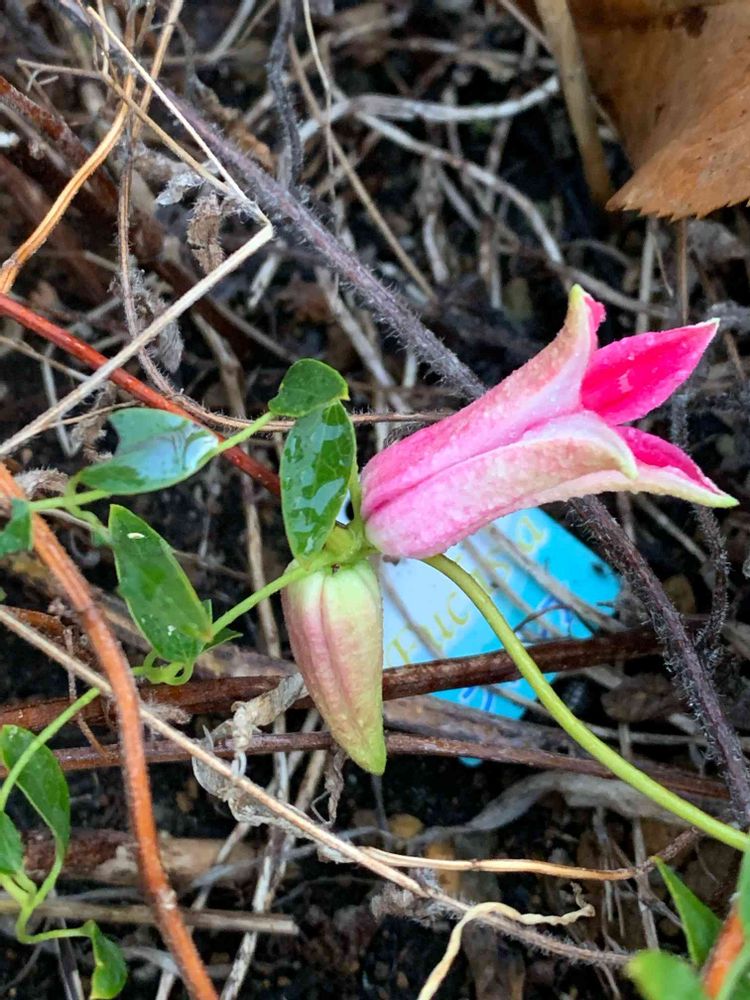 枯れた葉っぱばかりの中硬い蕾だった2日前今朝パトロールに出るとひっそり咲いてました。