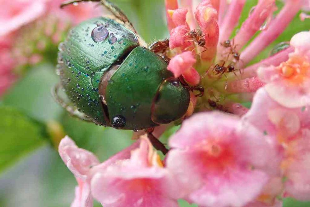 雨宿りしているコガネムシをアリが襲っているようにも見える