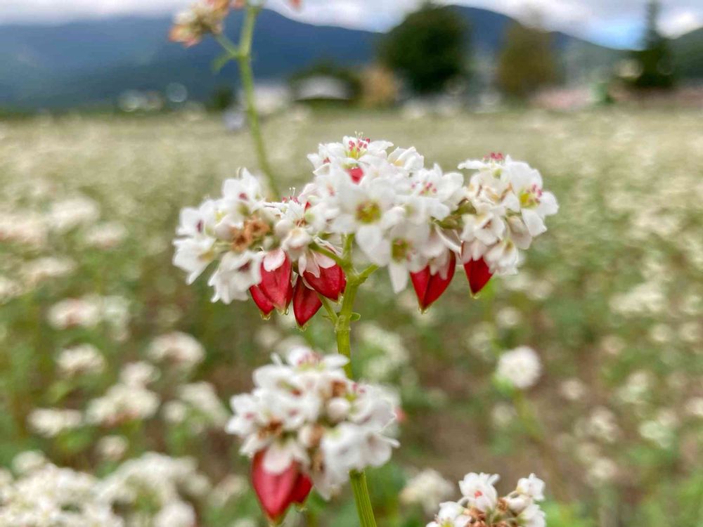 ソバ畑一面に広がる白い花と赤い果皮のコントラスト🤍💌