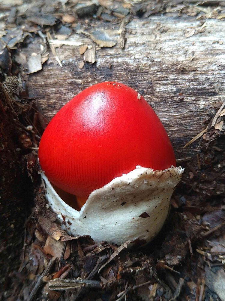 やっと見つけた!白い殻から飛び出した赤身の卵。今までは傘の開いたものばかり見てきたが。紅葉を前に地面から飛び出した秋の前触れ。たったの一本ではとても美しくて食菌でも採れない!登山者の皆様に見てもらいたい!2023.9.7 天生湿原