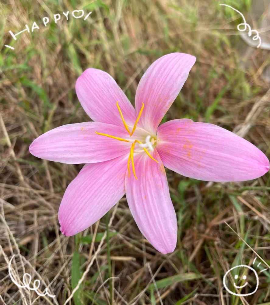 タマスダレよりちょっと花びら大きいかしら〜🤔草刈り後の野っ原にポツンと目立って咲いてましたよ♬つぼみちゃんも2つありました😍シベちゃん見えましたか〜❓かわゆすでしょ〜😆♬