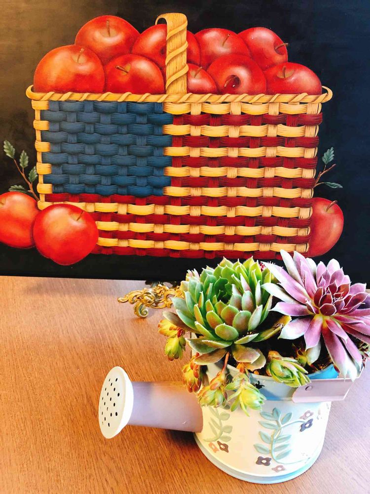 以前 描いた星条旗のバスケに🍎 色あせたジョーロの上を、思い切って缶切りでパッチヨ。センベルchan寄せてみたよ😊✨北海道は今☔️降ってきたし。✨✨✨