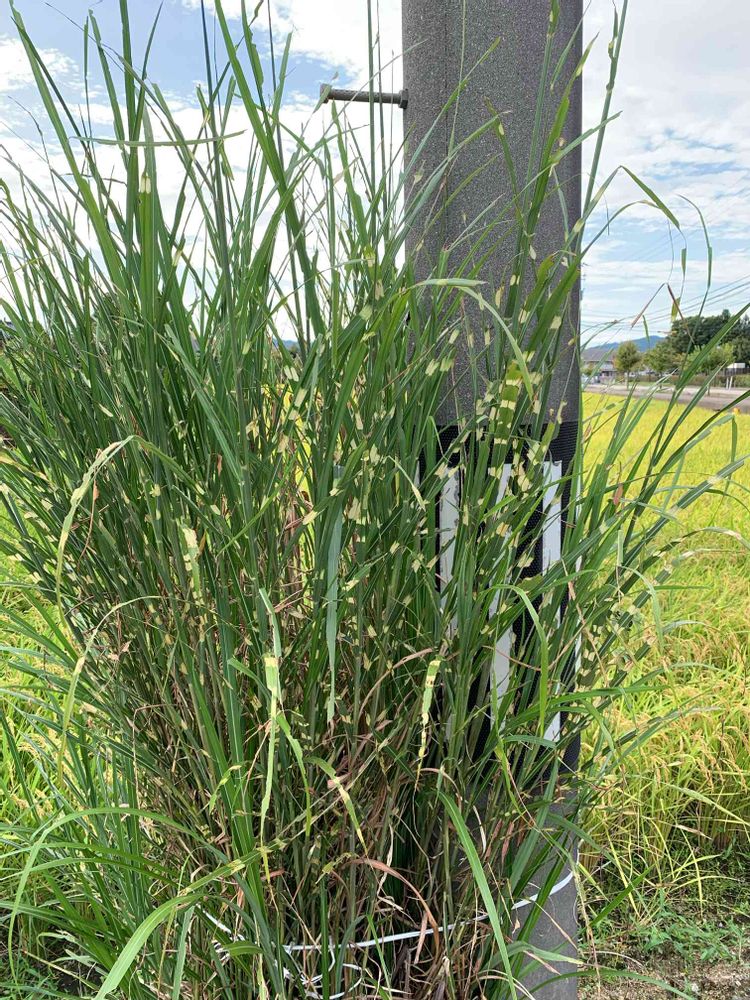 田んぼの横の電信柱に、広がらない様に?折れない様に?縛ってありました😺