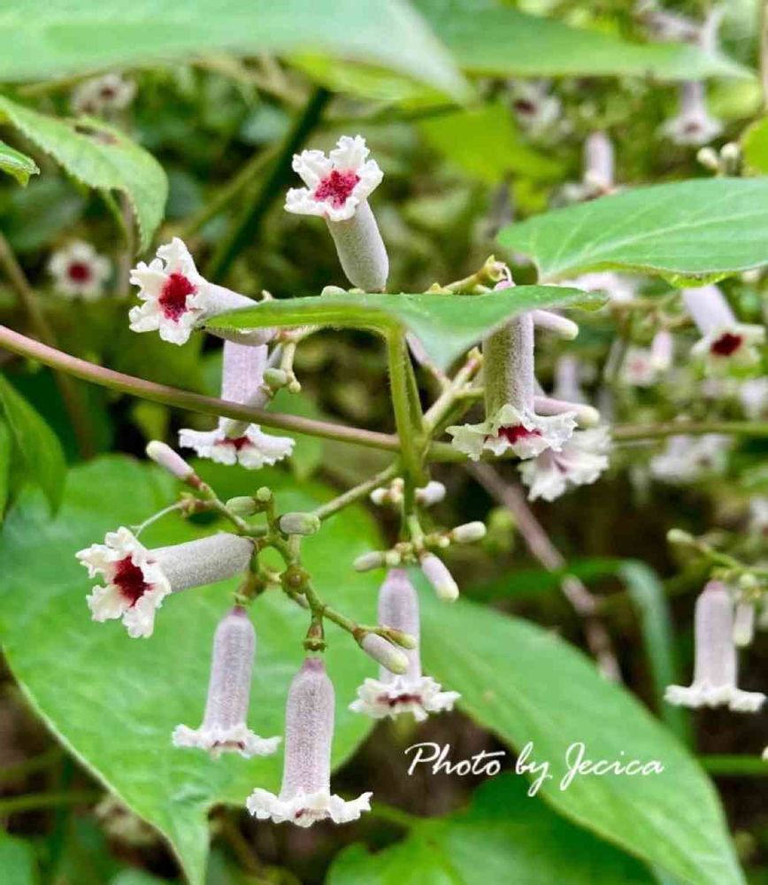 筒状の花の中心は赤く、名前に反して可憐な蔓性の多年草