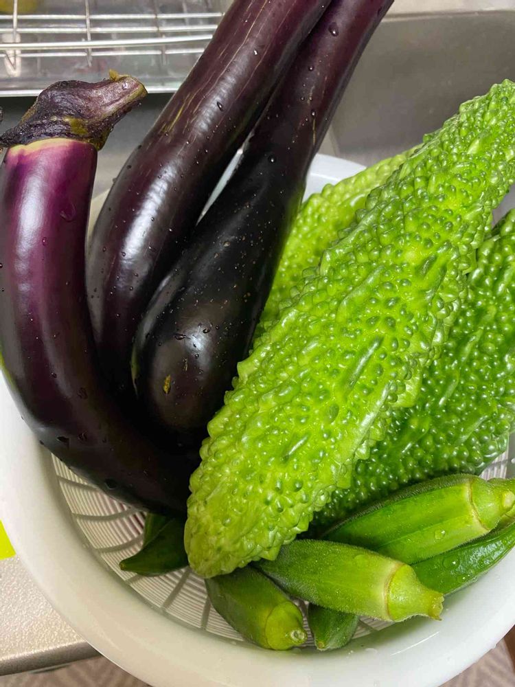 しかし、ゴーヤは黄色くなり、ナスは地面に着き、オクラは種になってました😅