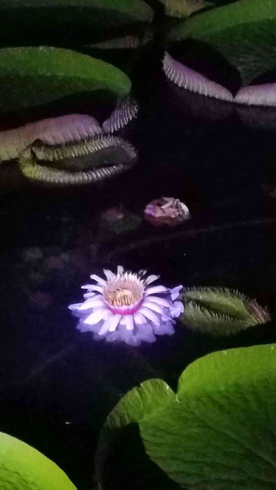 こちらは、2日目のパラグアイオニバスさんで、夜に咲いて、朝にはすぼみ、2日目の夜に又咲くのですが、2日目には、白から薄紫色に変わり、お花の中心が冠のようになります🪷