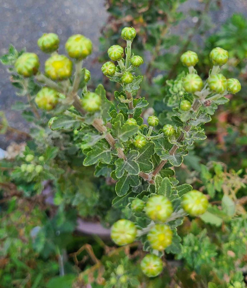 ここから咲くまで長いだろうが、真夏に枯れかけた菊。