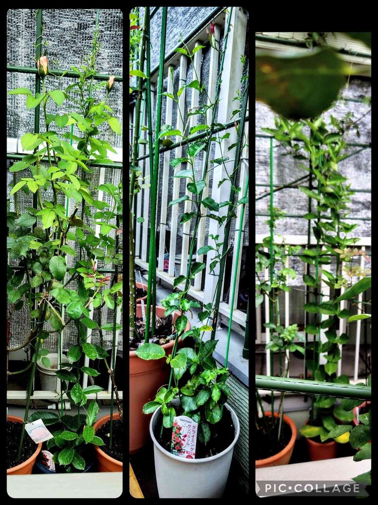 5月1日に第一回目の投稿しましたが、その後の成長は、予想外にとても遅く、花つきもあまりよくありません。ただ、ツルの数は多くなり、伸びたツルをビニタイで誘引しているところです。ツルの状態はいいので、9月後半から12月初旬にかけて、咲いてくれる気がします。以前、普通のマンデビラを育てたところ、秋になって初冬までよく咲いてくれたので、多分、その様になるのではないかと思っています。