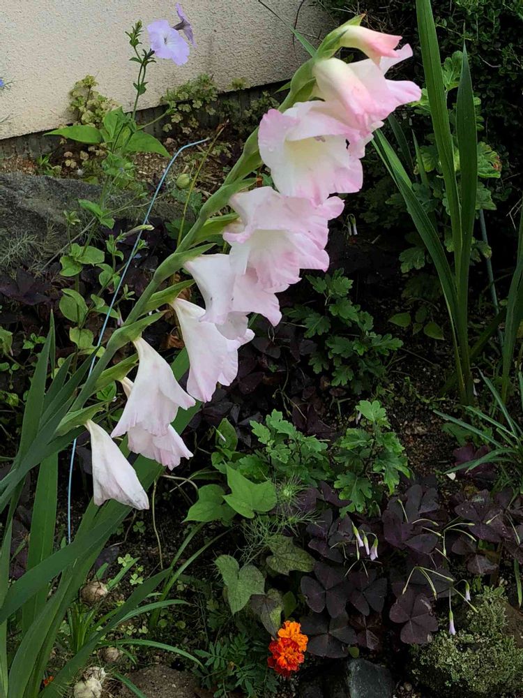 梅雨真っ只中に淡い色のグラジオラスが咲いていました。