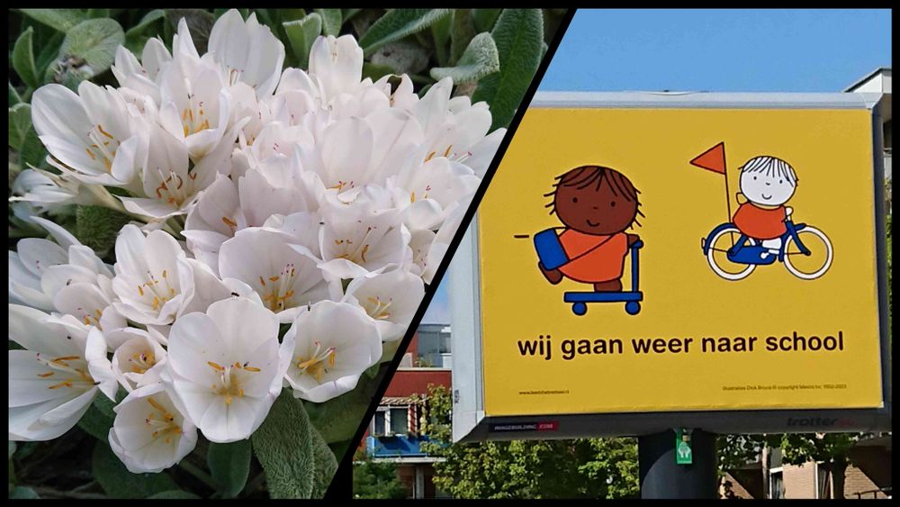 9月です♪秋クロッカスとも言われるコルチカムが咲いてました♪こちら🇳🇱は9月が新学年新学期なので右側の表示が小学校前なんかにどどんと表示されます。直訳すれば私達学校に戻って来てますってことなんですが、まぁどこの国の新入生も通学路🚸で余所見するってことですね😂