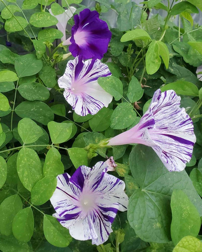 こぼれ種の朝顔さんが蕾のまま半開きで終わってたけど今月に入ってやっと花びらが開くようになり蝶豆さんと同じ鉢で咲いてます