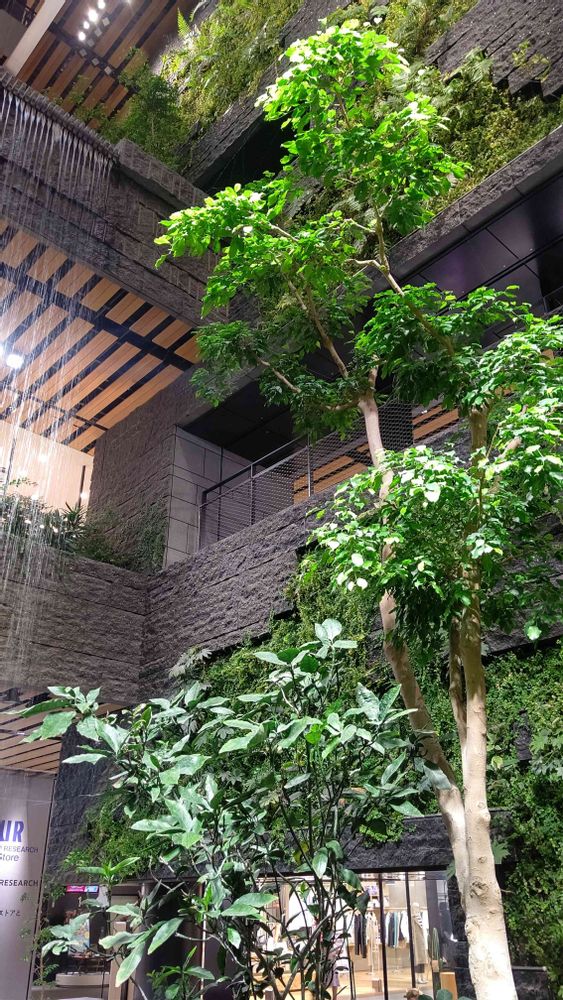 アミュプラザ熊本は屋内の人工滝と植物達がお出迎えしてくれます。
