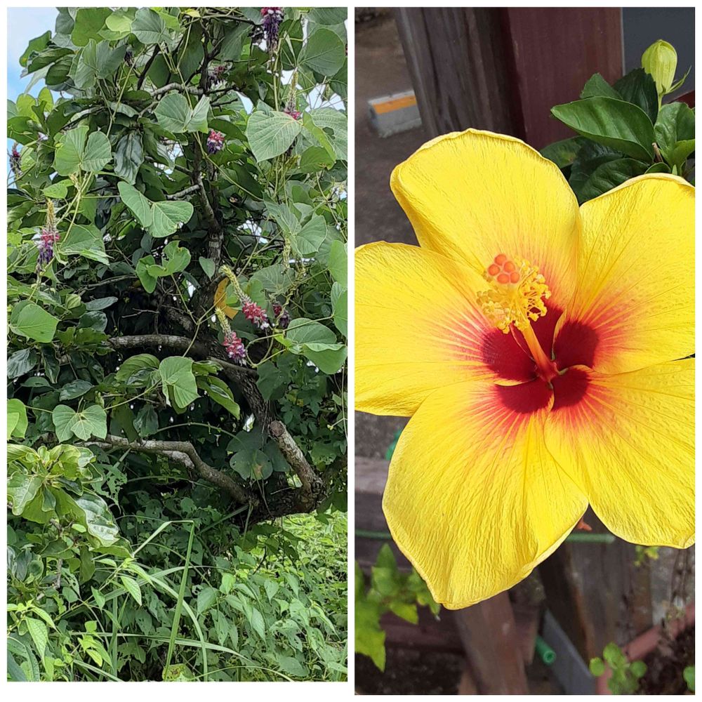 我が家から歩いて隣の家に行く途中の道端にクズの花が咲いていました。それからまた我が家のハイビスカス。最近はもうおわりが近いのかたまに咲いています。